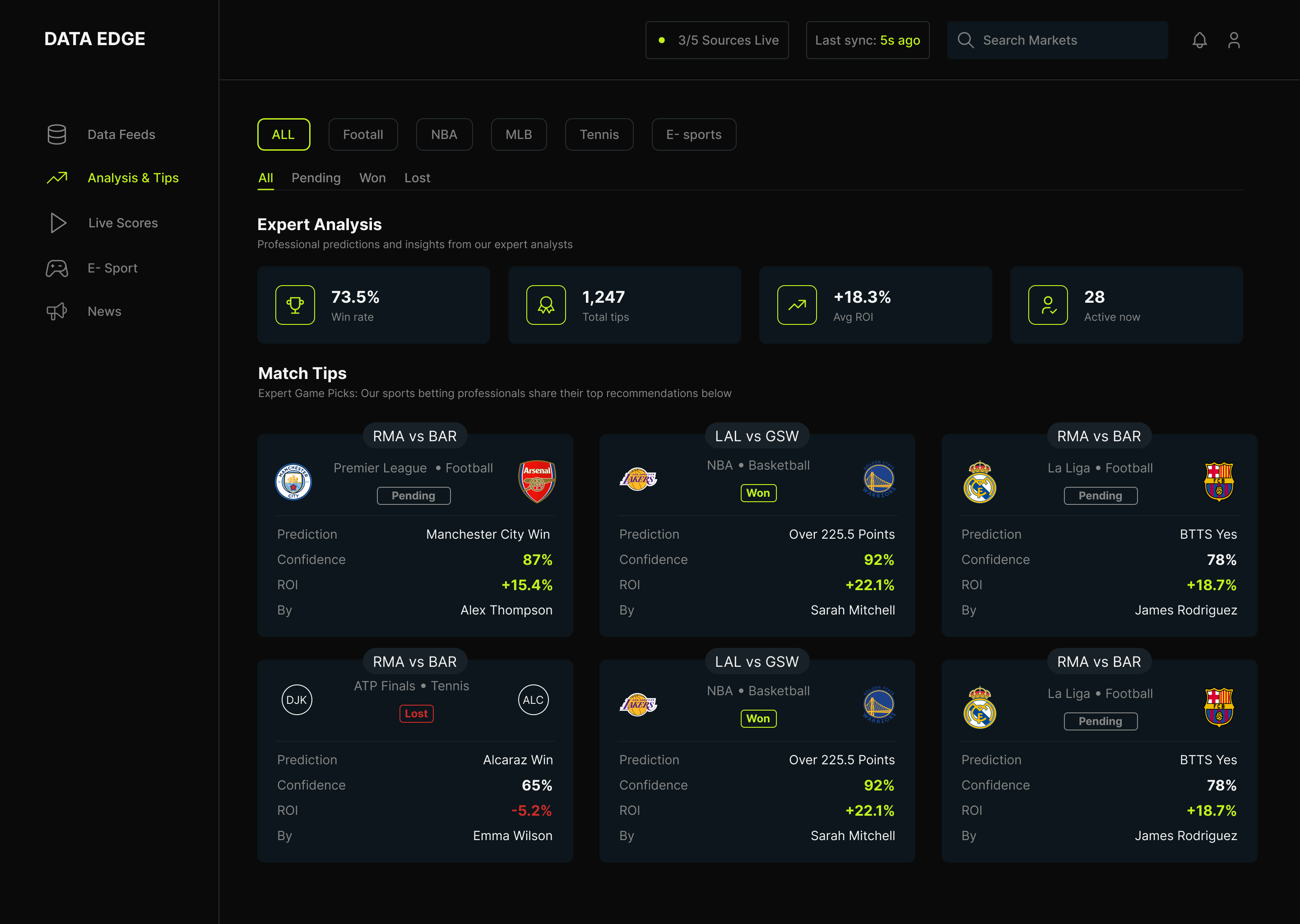 A sports intelligence platform giving bettors a real edge — unified odds, value signals, expert tips, and live scores across every sport and e-sports, in one fast dark app.